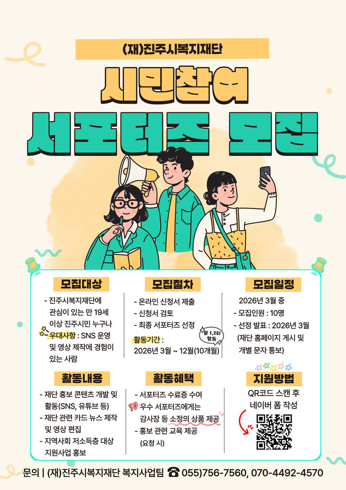 진주시복지재단(이사장 이성갑)은 시민과의 소통과 공감을 확대하고 지역사회 복지네트워크를 강화하기 위해 2026년‘제1기 시민참여(SNS) 서포터즈’를 모집한다고 4일 밝혔다.