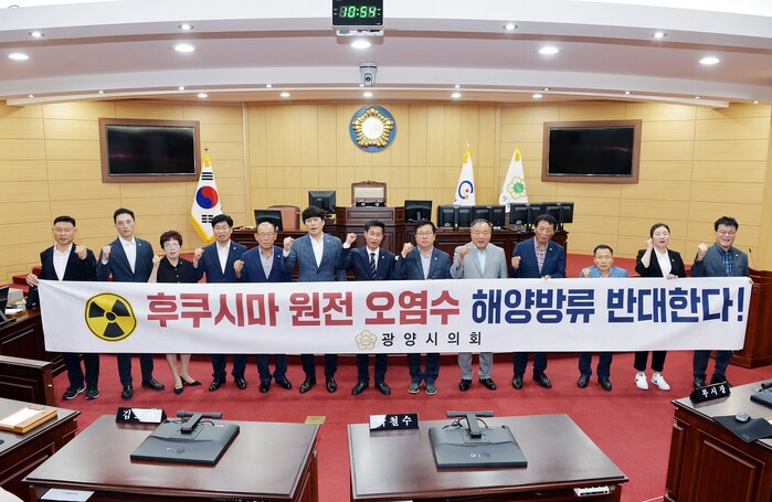 한편, 시의회는 정례회를 폐회하고 ‘후쿠시마 오염수 방류 반대’ 퍼포먼스를 본회의장에서 진행했다. 앞서 시의회는 지난 4월 ‘일본 원전 오염수 방류 피해 대책 특별법 제정 촉구 결의안’을 채택하였으며, 최근 최대원 의원은 ‘후쿠시마 원전 오염수 해양 방류 계획에 따른 광양시의 대응 방안 제안’에 대해 5분 발언을 한 바 있다.