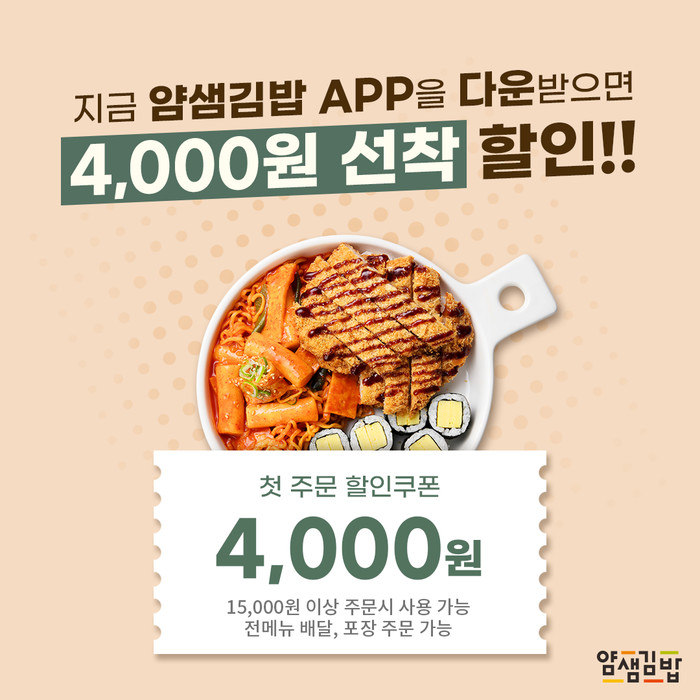 아울러 얌샘김밥은 어플 론칭을 기념해 신규 회원을 대상으로 첫 주문시 4,000원 할인 쿠폰을 제공하는 특별 이벤트를 마련했다. 4월 19일부터 5월 19일까지 15,000원 이상 주문시 할인 쿠폰을 사용할 수 있으며, 전메뉴 배달 및 포장 주문도 가능하다.