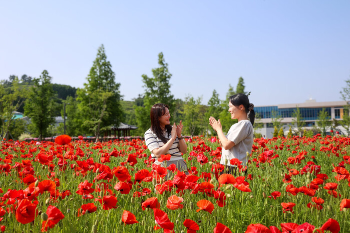 꽃양귀비 군락은 진주시농업기술센터가 조성한 약 4,700㎡ 규모의 야외 경관작물원에 개화하여 방문객들에게 눈길을 끌고 있으며, 오는 6월 초까지 감상할 수 있다.