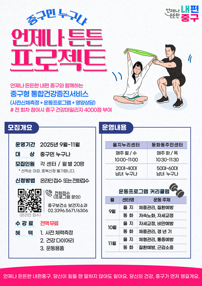 [시민일보 = 여영준 기자] 서울 중구가 구민 모두 체감할 수 있는 맞춤형 건강증진 통합관리 서비스 <중구민 누구나 언제나 튼튼 프로젝트>를 본격 추진한다.