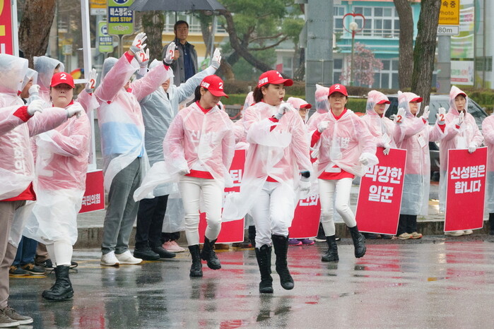 한편 신 후보는 비가 오는 가운데도 선거운동원들과 함께 비닐 우의를 입고 거창군청 로터리 앞에서 유세를 시작하며 굳은 의지를 다졌다. 또 합천읍 왕후시장에서 출정식을 갖고, 산청과 함양을 찾아 지지를 호소했다.