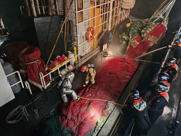 이날 저녁 11시 11분께 현장에 도착한 경비함정(513함)이 A호에 접근, 소화포 등 장비를 이용해 기관실 등 화재 진화작업 및 주변 해상 안전관리를 실시했다.