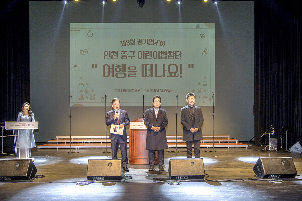 [인천=김형만 기자] ‘여행을 떠나요’라는 주제로 지난 11월 30일 열린 제3회 중구어린이합창단 정기연주회가 성황리에 마무리됐다. 이날 연주회에는 이종호 중구의회 의장과 김정헌 중구청장을 비롯한 내외빈이 참석해 자리를 빛냈으며, 합창단 단원들과 학부모들도 함께해 무대를 축하하고 응원했다.