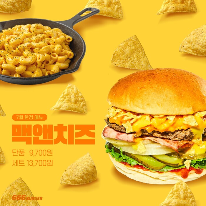 ‘맥앤치즈’ 버거는 전국 666버거 매장에서 7월 한 달간 단품 또는 세트로 구매할 수 있다.