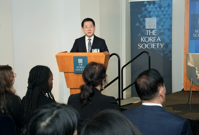 | ▲ 미국을 방문 중인 김영록 전라남도지사가 25일(현지시간) 뉴욕 맨해튼의 코리아 소사이어티 강당에서 ‘한미동맹의 진전과 글로벌 전남의 도약’이라는 주제로 연설을 하고 있다.(출처=전남도) |