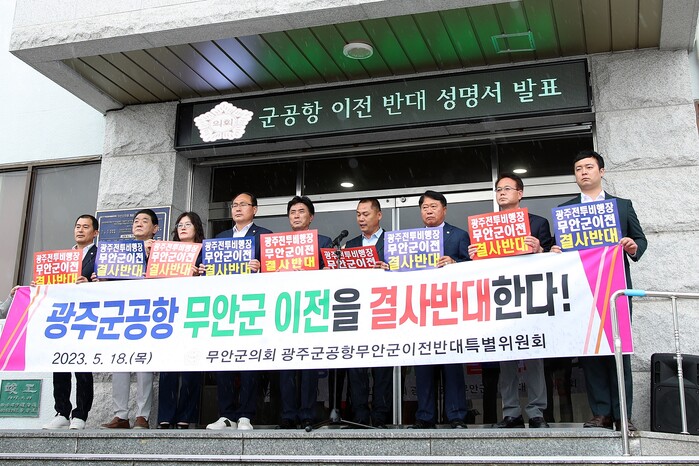 [무안=황승순 기자]무안군의회 광주 군공항 무안군 이전반대 특별위원회(이하 군공항 이전반대특위)는 18일 오후 2시 무안군의회 청사 앞에서 지난 15일 김영록 전남도지사에‘대승적 차원의 군공항, 민간공항 무안군 수용 요청’담화문에 대해 성명을 발표했다.