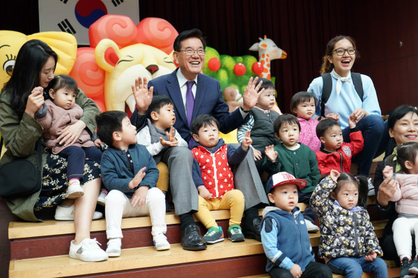 | ▲ 유덕열 구청장이 출산장려 행사에서 아이들과 함께 즐거운 시간을 보내고 있다. (사진제공=동대문구청) | ||