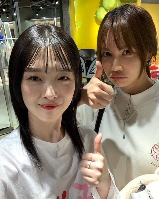 사진 속 설리는 '진리상점'과 함께한 패션브랜드 팝업스토어를 배경으로 양미라와 엄지를 치켜들고 있다.