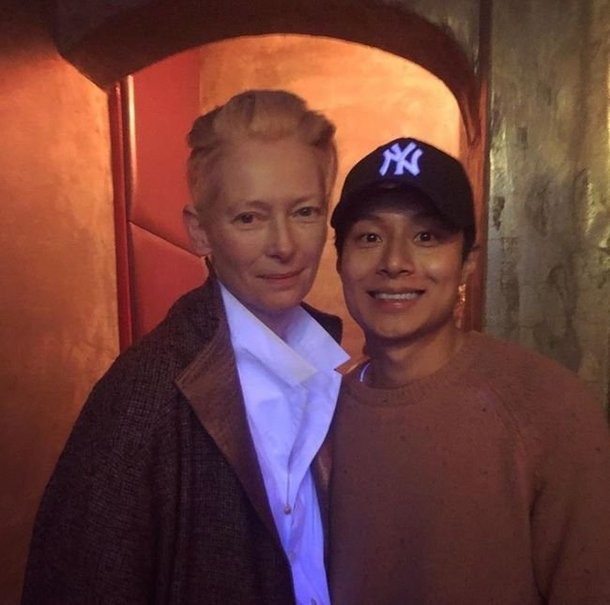 공개된 사진 속에서 김충재는 틸다 스윈튼과 다정하게 포즈를 취한 채 환한 미소를 짓고 있다. 특히, 아이처럼 신난 김충재의 표정이 눈길을 끈다.