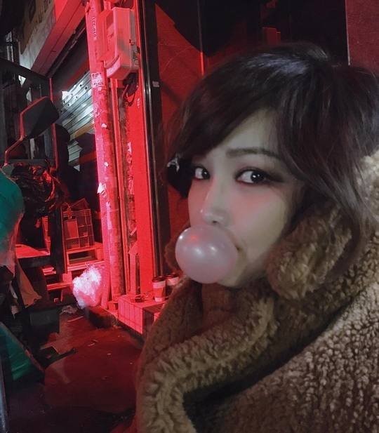 사진 속 이유리는 짙은 화장을 하고 풍선껌을 불며 카메라를 응시하고 있다. 무서운 표정이지만 아름다운 미모가 눈길을 사로잡는다.