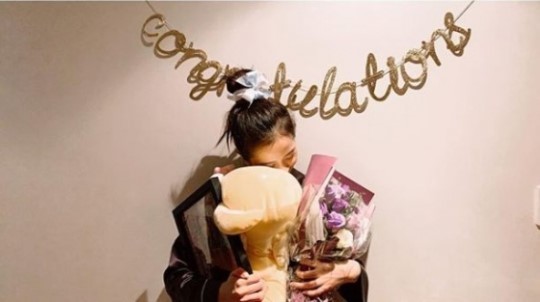 멘션과 함께 공개된 사진에서 지수는 꽃다발과 선물을 들고 행복에 겨워 하고 있다.