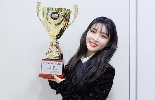 이날 청하는 '벌써 12시'로 컴백하자마자 1위 트로피를 거머쥐는 영광을 누렸다. 공개된 사진 속에서 청하는 '쇼챔피언' 트로피를 들고 기쁨을 만끽하는 모습.