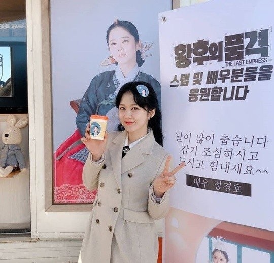 지난 5일 오후 장나라는 자신의 인스타그램을 통해 "#황후의품격#정경호 한번더 해피엔딩의 세상 멋진 송수혁,착한 경호가 저희 황품팀 힘내라고 커피차를 보내줬어요^^ 힘든 촬영중 모두들 즐거워 하셨어요! 많이 지치고 힘들때 함께 으쌰으쌰하던 소중한 동생의 응원 고마웡!!!!"이라는 글과 함께 몇 장의 사진을 게재했다.