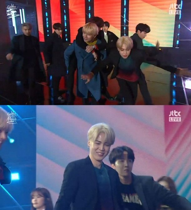 이날 시상식 초반 음반 부문 본상 후보들이 차례대로 무대에 등장했다. 마지막으로 등장한 방탄소년단은 독특한 등장 퍼포먼스를 선보였다. 멤버 뷔가 슈가를 업고 등장한 것이다.