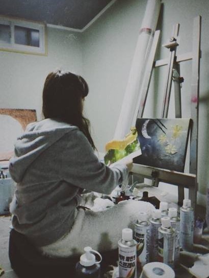 사진은 구하라의 뒷모습을 담고 있다. 구하라는 캔버스에 달, 별 등을 그리는 작업에 빠져 있다. 아직 미완성의 그림이지만 훌륭한 그림 실력이 돋보인다.