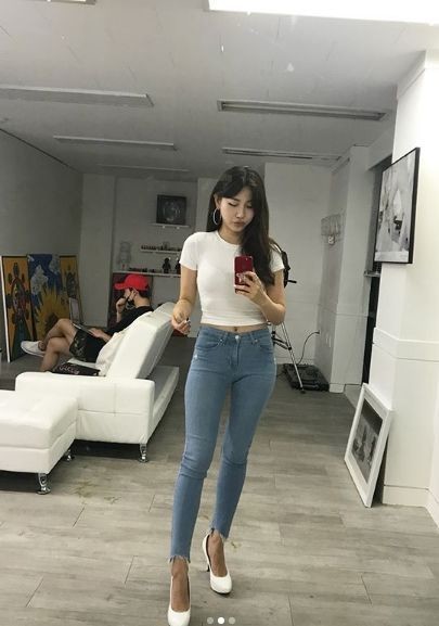공개 된 사진 속 이수정은 청바지에 흰티로 완벽한 바디라인을 들내고 셀카를 찍고 있다. 특히, 살짝 드러낸 개미허리가 남성팬들을 설레게 한다.