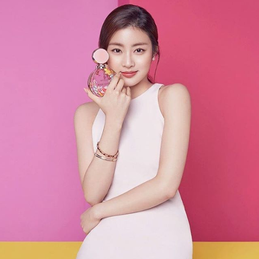사진 속 강소라는 향수병을 들고 콜라병 몸매를 자랑하며 사진을 찍고 있다.