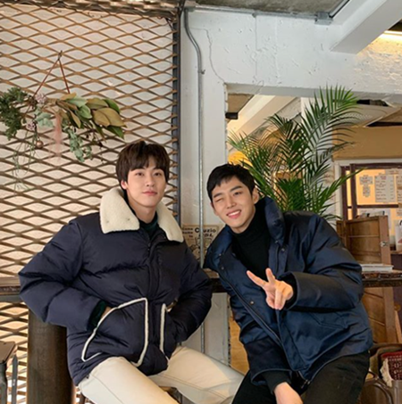사진 속 그는 따뜻한 패딩을 입고 주머니에 손을 넣은 채 카메라를 바라보고 있다. 옆에 있는 홍석은 브이를 하고 윙크를 보여주며 훈훈함을 드러냈다.