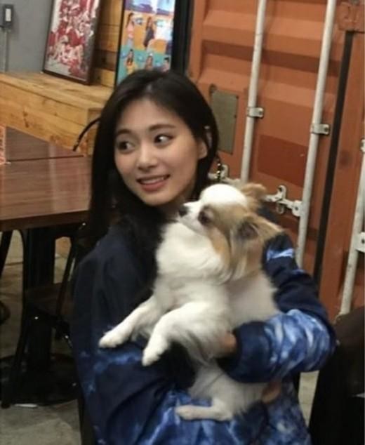 쯔위는 휴가차 고향인 대만을 방문 중이다. 사진은 쯔위의 부모님이 운영하는 대만 카페에서 찍힌 것으로, 쯔위는 이곳에서 반려견을 품에 안고 시간을 보내고 있다.