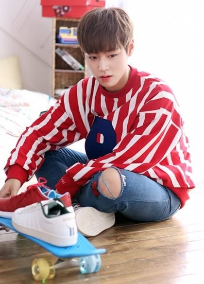 공개된 사진 속엔 화려한 색감의 티와 청바지를 매치한 박지훈이 바닥에 앉아 시선을 아래로 향하고 있다.