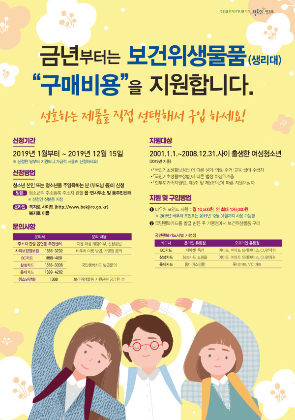 지원대상은 만 11~18세 여성 청소년(2001년 1월1일~2008년 12월31일 출생자)으로, 국민기초생활보장법 또는 한부모가족지원법에 따른 자격기준을 갖춘 자다.