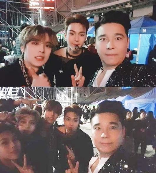 게재된 사진 속 임창정은 몬스타엑스 멤버들과 카메라를 응시하고 있다. 임창정과 몬스타 엑스 멤버들은 미소를 지어 화기애애한 분위기를 드러냈다.