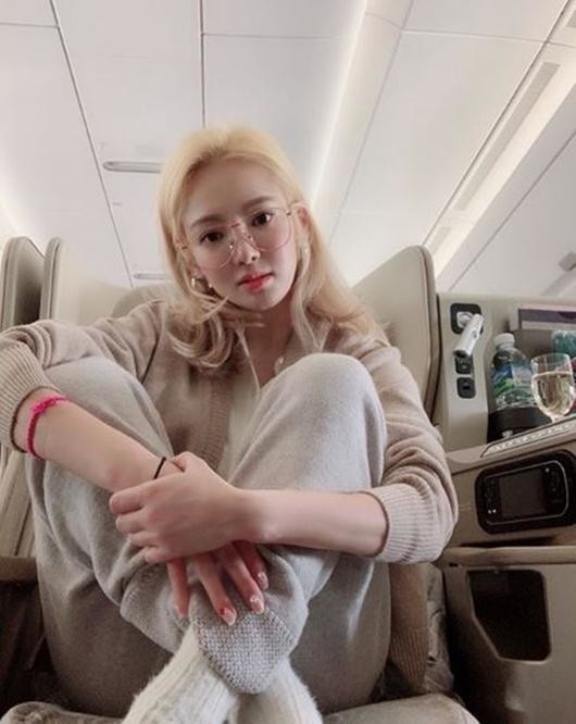 게재된 사진 속 효연은 비행기에 탑승한 채 카메라를 응시하고 있다. 효연은 카디건과 통이 넓은 바지를 입어 귀여운 숙면 패션을 선보였다.