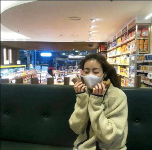 사진 속 강소라는 마스크를 껴고 양손에 고구마를 쥐고 뿌듯한 표정을 지었다.