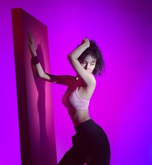 공개된 사진 속엔 현아가 핑크색 탱크탑을 입고 팔을 올린 포즈를 취하고 있다.