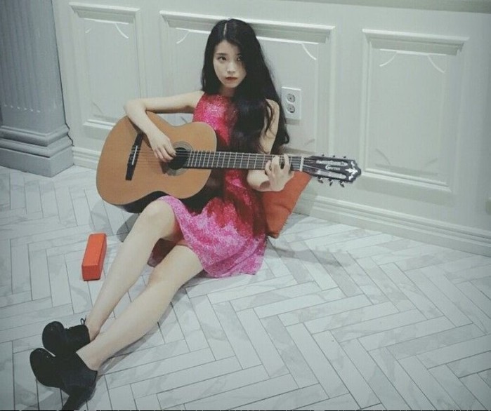공개된 사진 속 아이유는 핑크색 미니 원피스를 입고 긴 머리를 늘어뜨린채 기타를 치고 있다.