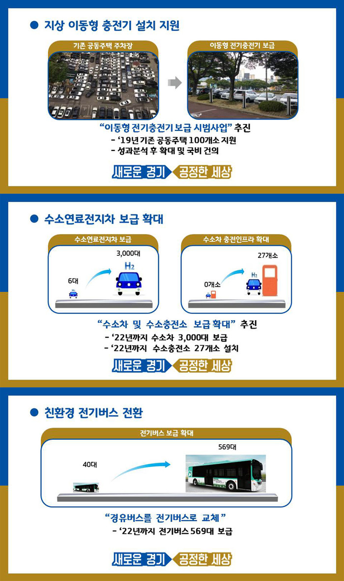 오는 2022년까지 6,643억 원의 예산을 투입해 ▲전기차 약 3만대 ▲전기버스 569대 ▲전기충전소 1만5천기 ▲수소차 3,000대 ▲수소충전기 27대 등 친환경차를 확대.보급하고 관련 인프라를 구축해 나간다는 계획이다.