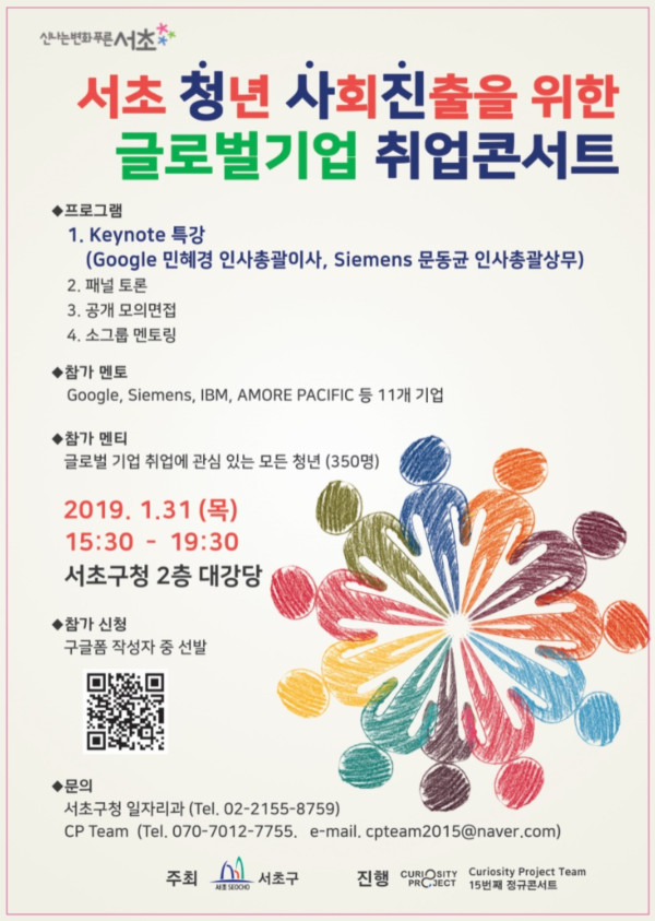 [시민일보=이대우 기자] 서울 서초구(구청장 조은희) 구청 대강당에서 오는 31일 구글코리아, 지멘스코리아 등 11개 글로벌기업 인사담당자와 현직 재직자들이 입사 꿀팁을 알려주는 ‘글로벌기업 취업콘서트’가 개최된다.