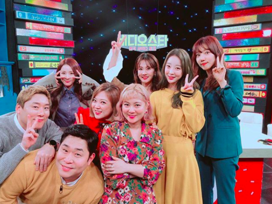 사진 속에서 MBC에브리원 ‘비디오스타’의 고정 MC로 합류한 산다라박이 MC 박나래, 박소현, 김숙을 비롯해 게스트 문세윤, 최성민, 이채영, EXID 혜린과 사진을 찍고 있는 모습이다.