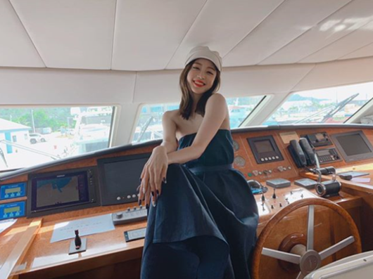 한예슬은 22일 자신의 인스타그램에 "방긋"이라는 문구와 함께 한 장의 사진을 게재했다. 사진 속 그는 남색 원피스를 입고 흰 모자를 쓴 채 다리를 꼬고 있다.