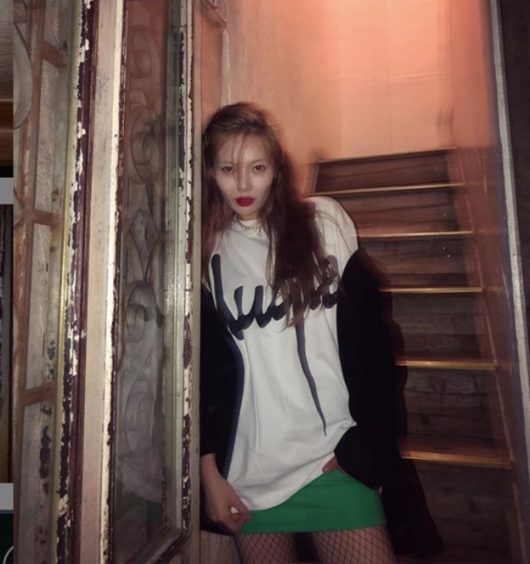 현아는 23일 자신의 SNS를 통해 여러 장의 사진을 게재하며 팬들과 소통에 나섰다. 공개된 사진에는 망사스타킹에 초록색이 돋보이는 미니스커트, 흰색 티셔츠를 매치한 현아의 모습이 담겨 있다.
