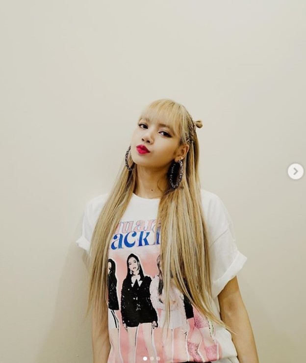 공개된 사진 속 리사는 블랙핑크 멤버들이 프린팅된 티셔츠를 입고 카메라를 응시하고 있다. 특히, 화려한 이목구비와 레드립이 눈길을 끈다.