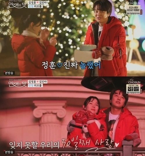 24일 방송된 TV조선 '우리가 잊고 지냈던-연애의 맛'에는 김정훈, 김진아 커플이 연애 50일째를 맞아 놀이공원 데이트를 즐기는 모습이 그려졌다.
