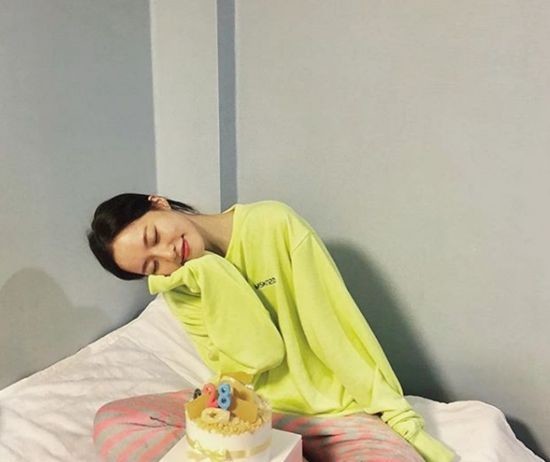 공개된 사진 속엔 배윤경이 침대에 앉아 케익을 앞에 두고 손을 뺨에 대고 눈을 감고 있다.
