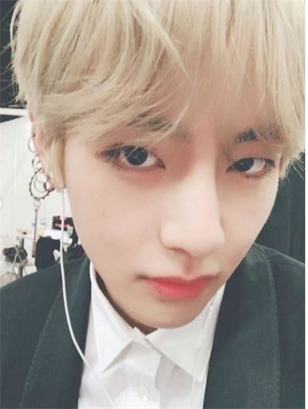 공개된 사진 속엔 금발의 뷔가 인이어를 착용한 모습으로 카메라를 응시하고 있다.