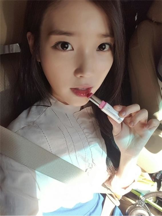 공개된 사진 속 아이유는 차안에서 립스틱을 바르며 카메라를 빤히 응시하고 있다.