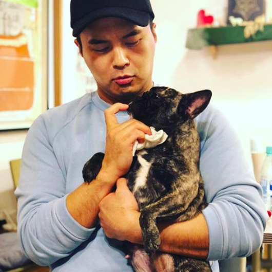 공개된 사진에는 정준이 편안한 복장을 입고 강아지를 안고 있는 모습이 담겨있다.