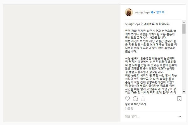 빅뱅 멤버 승리가 자신의 인스타그램에 게재한 사과문은 아래와 같다.