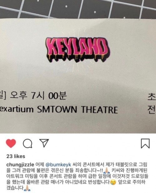김충재는 4일 자신의 인스타그램을 통해 "관람에 불편을 겪으신 분들 죄송합니다. 어제 샤이니 키 씨의 콘서트에서 제가 태블릿으로 그림을 그려 그 불빛에 관람에 불편을 겪으신 분들 죄송합니다. 키 씨와 진행하게 된 아트워크 관련 미팅을 갖고 이후 콘서트 관람을 하며 타이트한 일정에 이것저것 드로잉과 스케치를 했는데 올바른 관람 매너가 아니었음을 깨달았습니다. 반성합니다"라는 사과문을 게재했다.