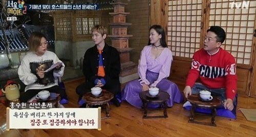 4일 오후 방송된 tvN 예능프로그램 ‘서울메이트2’에서는 김숙이 새해를 맞아 홍수현, 키, 김준호의 신년운세를 공개했다.