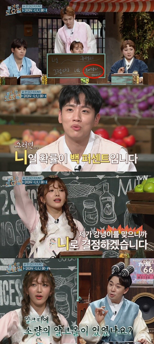 이날 닭 한 마리를 걸고 마마무의 ‘너나 해’ 문제가 출제 됐다. 제일 먼저 받쓰판이 공개 된 동현은 “‘태연은 아니니’라고 들었다”고 주장했다. 이에 혜리는 “저도 들었다. 태연이라고” 덧붙였다.