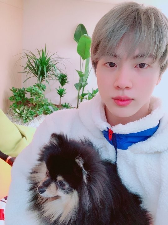 공개된 사진 속에는 진이 품에 뷔의 반려견 탄이를 안고 카메라를 응시하고 있다.