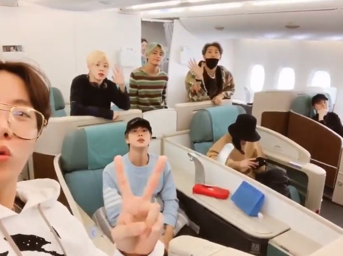 공개된 사진 속 방탄소년단 멤버들은 미국으로 향하는 비행기에서 환한 표정으로 카메라를 바라보고 있다.