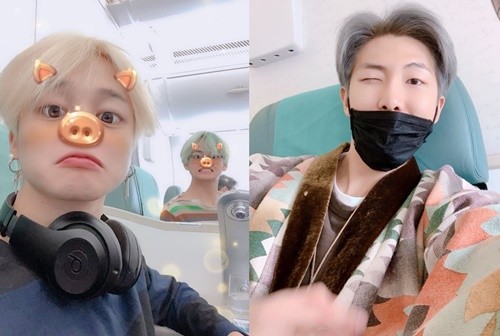 인증샷 속 방탄소년단 뷔와 지만, RM은 비행기 안에서 자유로운 모습으로 카메라를 응시하고 있다.