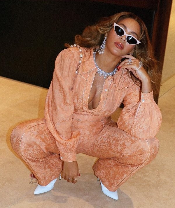 공개된 사진 속 비욘세는 살구색 점프 수트를 입고 바닥에 쪼그려 앉아 포즈를 취하고 있다. 살짝 깊은 V넥 라인에 드러난 볼륨 몸매가 시선을 사로잡는다.